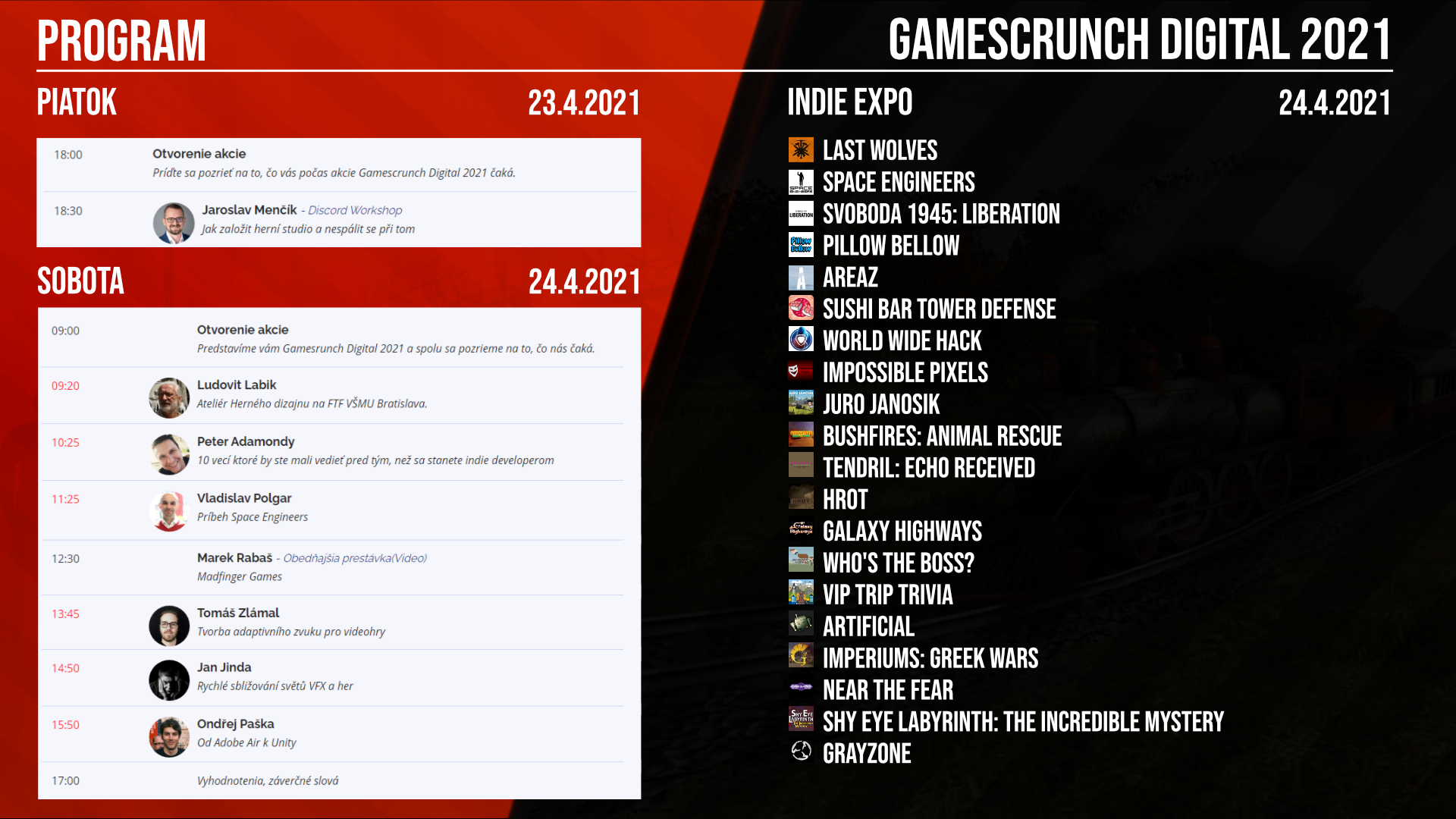 V sobotu se pak akce rozjede naplno a čeká vás celodenní program s mnoha zajímavými hosty. Kromě šesti živých přednášek, bude probíhat také Indie Expo kde se představí na dvacet větších či menších indie her, mezi kterými budou například FPS Hrot, strategie Grayzone a Imperiums: Greek Wars, nebo platformer Pillow Bellow a mnoho dalších, ve kterých by měl každý najít svého favorita ať už má rád jakýkoliv žánr.
