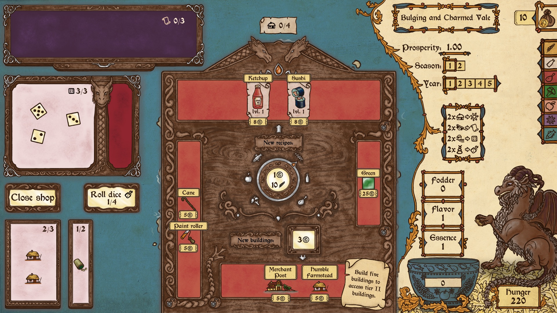 Hra nabízí přes dvacet typů kostek — od sudých a lichých až po extrémní varianty se šesti šestkami. Doplňuje je více než padesát budov a osmdesát receptů, které lze kombinovat a přestavovat podle aktuální situace.