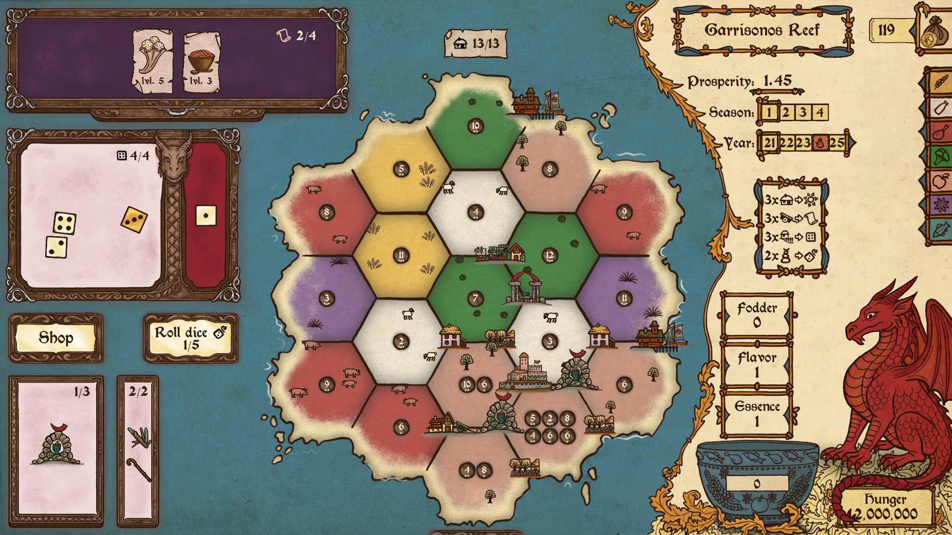 Hratelnost stojí na hodech kostkami, které aktivují políčka na hexagonálním ostrově. Sklizeň surovin, vaření, stavění budov a optimalizace herní plochy se propojují do systému, který odměňuje plánování, ale nikdy nedá hráči plnou kontrolu.