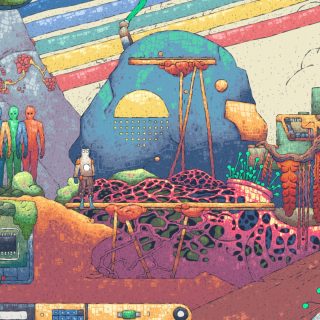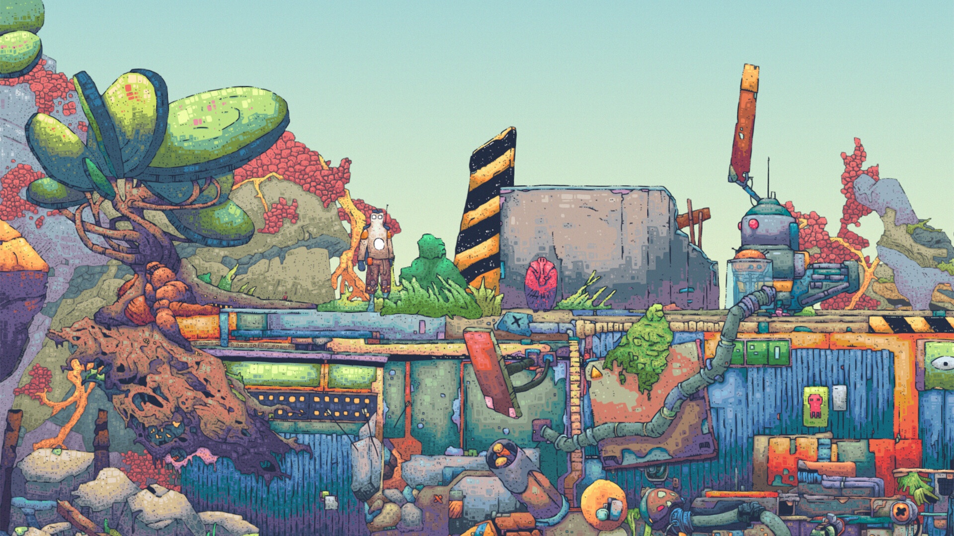 HEAVYDELIC se popisuje jako 2D Slavic Synthpunk Platformer vysílající na mrtvých frekvencích. Syntetická psychedelie, komiksový art, VHS kazety, analogové ruiny a roboti vzkříšení ze slovanské mytologie — to jsou pilíře vizuálního světa hry. Každý asset je ručně nakreslený autorem Eniacem, od postav přes prostředí až po nepřátele.