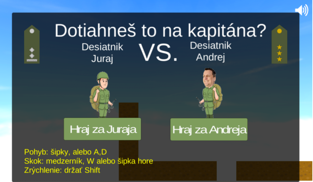 Dotáhneš to z obyčejného desátníka až na kapitána? Pokud budeš hrát za postavu Andreja Danka, nejspíš jsou tvé šance vysoké. Předseda Národnej rady Slovenskej republiky způsobil v roce 2017 skandál, když vyšlo najevo, že jeho vojenská hodnost z ničeho nic astronomicky vzrostla o osm úrovní. Stalo se tak dokonce ještě v roce 2016, v tichosti bez zbytečné mediální pozornosti. Opoziční poslanci upozornili kapitána a ministra obrany, Petra Gajdoše, že „v armáde je na takýto postup potrebných 30 až 35 rokov driny, aby sa z desiatnika stal kapitán.“3 Danko sloužil v armádě v 90. letech a od té doby projevoval zájem o militární dění jen z tepla kanceláře ministerstva obrany. Dle jeho názoru si však povýšení zasloužil, zejména podporou modernizace ozbrojených sil a pomocí v urychlovaní přijetí zákona o dobrovolné vojenské službě. Samozvaný válečný hrdina poté na důkaz svého odhodlání políbil vojenské výložky a zapsal se do dějin internetu jako nové meme, a v neposlední řadě i jako krátká satirická hra. Ta v úvodu nabízí na výběr dvě postavy: desátníka Juraje nebo desátníka Andreja. Desátník Juraj je obyčejný voják, který musí na dlouhé cestě za vytouženou hodností pořádně zamakat. Desátník Andrej má život o něco snadnější. Když spadne do propasti, vynoří se z ní pomoc v podobě ministra Gajdoše a vynese ho zpátky na povrch. A aby toho nebylo málo, při prvním checkpointu vyzvedne Andreje helikoptéra, která ho odveze rovnou k hodnosti kapitán.
